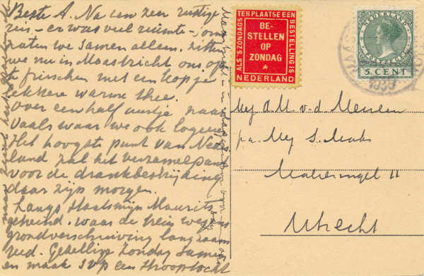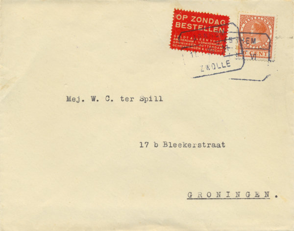 Tenslotte verschijnt omstreeks half 1935 het etiket "OP ZONDAG BESTELLEN" met daarbij vermeld de gemeenten waar nog een